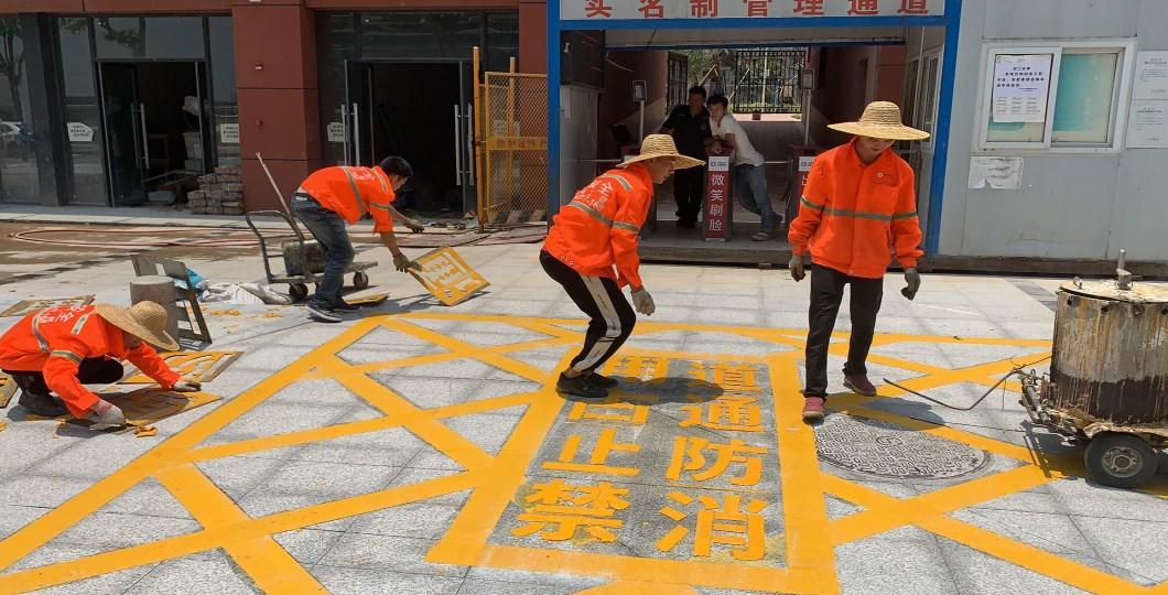 做好前奏的工作,劃線的時候,把消防通道,禁止占用字樣的模板放到測好的位置,然后把熱熔涂料涂抹上去,就OK了,是不是和小時候照著模板畫畫一樣吶。當然涂料的調配,反光玻璃珠施放還是要一定的經驗知識和技巧。