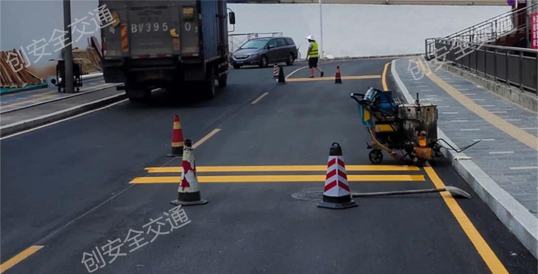 涂敷施工后,標線會出現多出或不整齊等現象,這時要及時對不符合要求的標線進行修整,去除溢出或垂落的涂膜。檢查標線厚度 、尺寸 、玻璃珠撒布情況和標線 的形狀 ,以便后續施工 中及 時進行調整 。施工后的現場也需要進行適當的清理 ,例如撒落 的玻璃珠要及 時清理 ,以防止行人滑倒或車輛打滑造成危險。標線干燥硬化后,將所有施工車輛、設備、人員轉移到安全地帶,將封閉交通的安全設施撤離現場開放通車 。