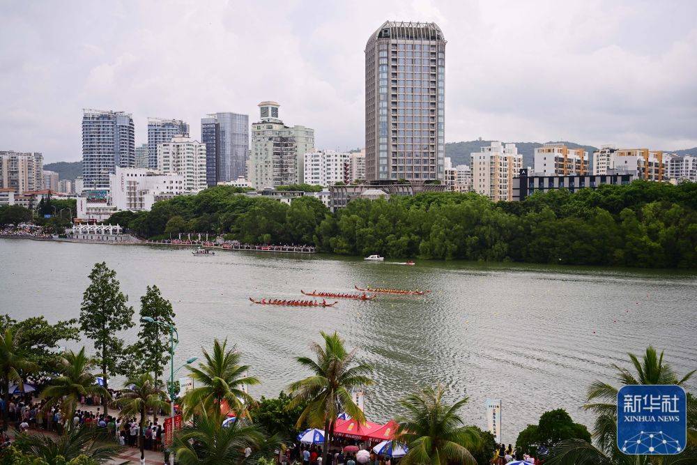 ↑ 6月18日,龍舟隊在海南省三亞市三亞河上進行比賽。新華社發(沙曉峰攝)