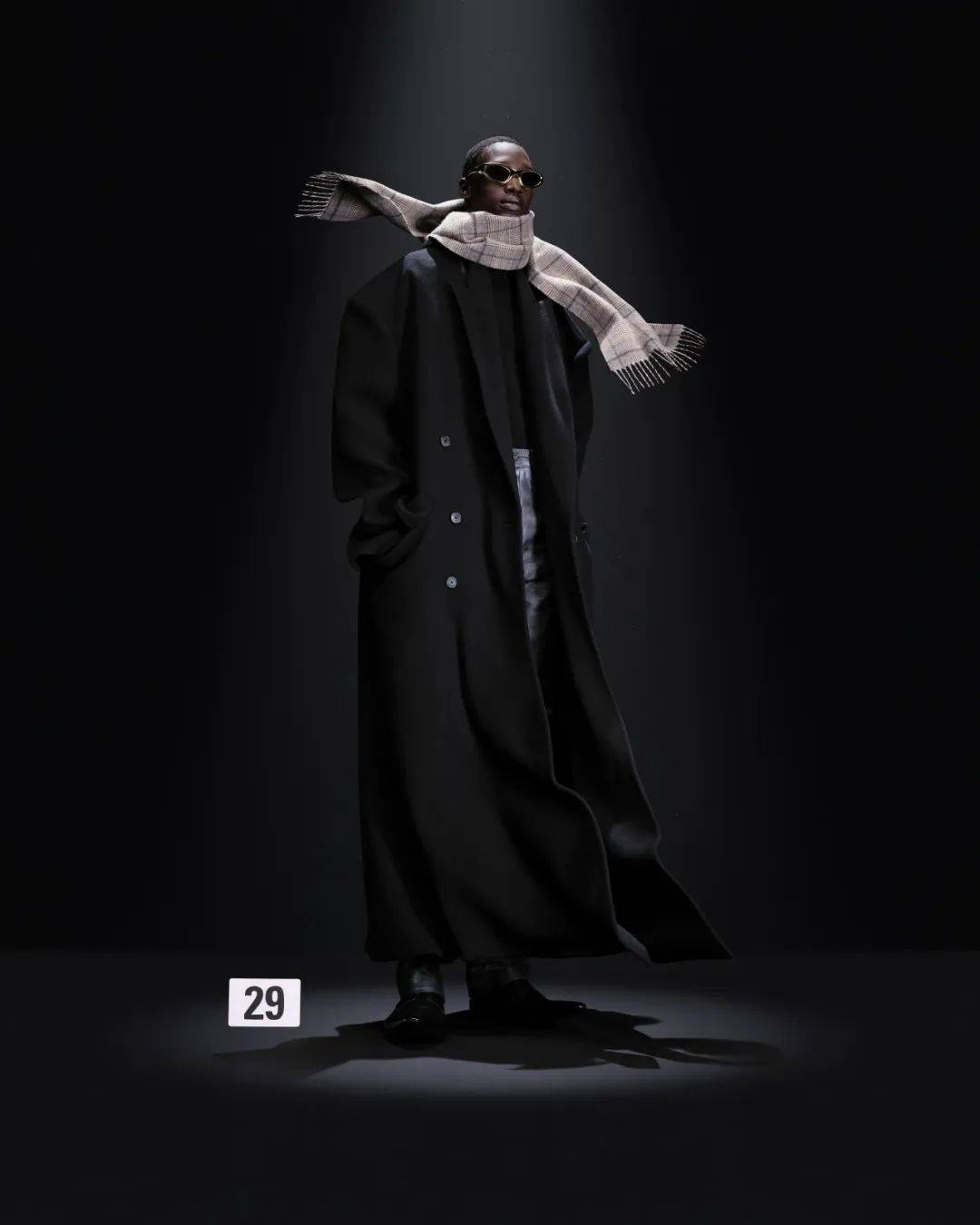 接下來是本季中重要的構型方式:雕塑感精剪造型。筆挺有力的肩部設計、弧形的V領線條,這些元素的靈感源自創始人時期的設計,包括定制外套的下擺和收腰廓形。此外,男士西裝所用的面料看似是威爾士親王格紋或是細條紋羊毛,實則都是由日本丹寧牛仔布在古董織機上織造而成的。