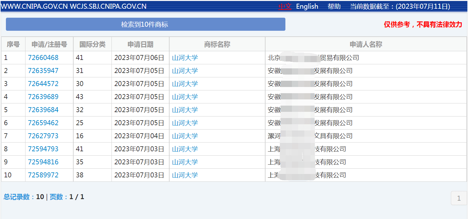7月13日,記者查詢發現,在中國商標網官網“山河大學”的商標查詢頁面已出現10個注冊號,都是在7月3日至7月6日之間申請注冊,并且安徽某文化發展公司申請注冊了5個不同類別的商標,包括飲料啤酒和餐飲住宿等國際分類,而這些商標申請都處于“正等待受理”狀態中。