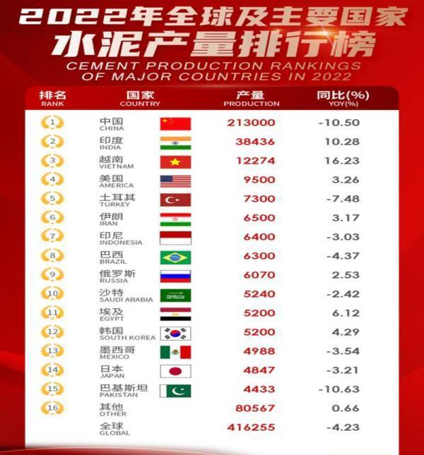 2022年,全球水泥產量41.6億噸,中國21.3億噸,占比51.2%。印度第二3.84億噸,占比9.2%。中國人均產水泥1.51噸,外國人均0.31噸。中國人均水泥產量世界最高,比韓國高50%。沙特人均1.46噸與中國接近,當地也在大興土木。越南、土耳其、伊朗建設力度也較高。越南人均1.25噸,但出口3500萬噸,主要是高污染的水泥熟料,遠期可能增長到1億噸出口。因為區位優勢明顯,中國就大量進口越南水泥。