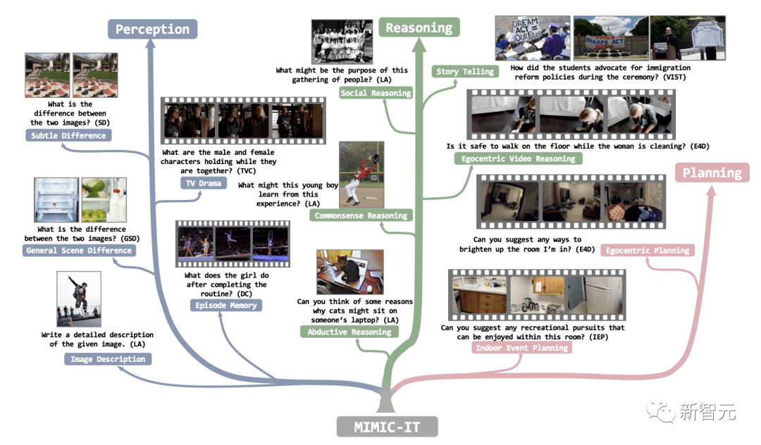 MIMIC-IT的數據集包括280萬個多模態指令——反應對,涵蓋以下基本能力:感知、推理,以及計劃。