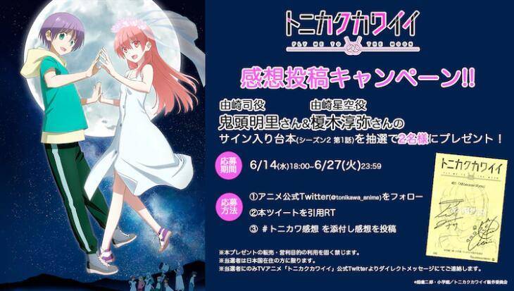 作為《總之就是非常可愛 女子高中篇》的配信紀念,在動畫《總之就是非常可愛》的官方推特賬號(@tonikawa_anime)上,將舉辦抽獎活動,選出2人獲得鬼頭明里和星空聲優榎木淳彌的簽名腳本。有意者請在6月27日23點59分之前關注動畫的官方推特賬號,引用并轉發相應的推文,添加主題標簽“#トニカワ感想”并發表感想。