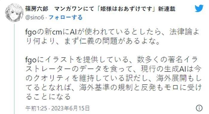 由于FGO官方始終沒對這次問題進行回應,懷疑使用了AI的玩家與否定使用了AI的玩家在網上撕成了一片。此外,也有部分知名人士參與了這場討論。日本畫師篠房六郎發推吐槽稱:如果這次FGO的新CM使用了AI,那么比起法律,首先是仁義的問題。有很多著名畫師為FGO提供了插畫,AI吸收了他們的數據才能維持現在的品質。如果這種情況在海外出現,也會因為海外的標準受到很多限制和反對。另外,像現在這種因為模型崩壞成為話題,卻沒標注“AI生成”的AI產物,幾乎等同于有害垃圾。