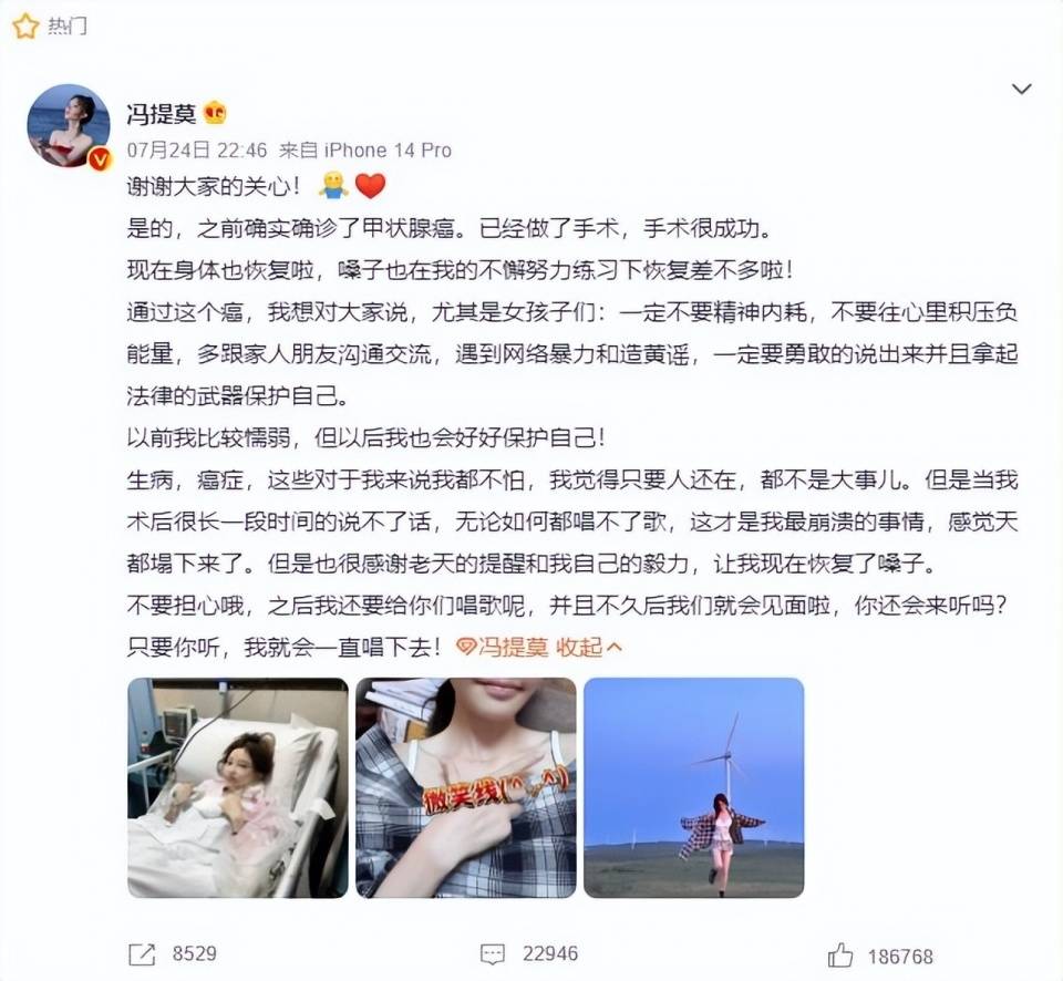后來馮提莫看到自己上熱搜后,在第一時間通過微博發聲回應,感謝大家對她的關心,承認自己確實確診了甲狀腺癌,做完手術后身體也恢復的差不多,相信不用等多久的時間,她會再展歌喉證明自我。